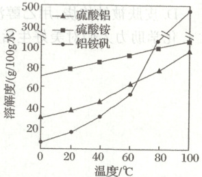 (保留三位有效数字)。(5) 铝铵矾${[NH_{4}Al(SO_{4})_{2}· 12H_{2}O]}$是一种水絮凝剂。请补充由“转化”后的滤液制取铝铵矾的实验方案,部分物质的溶解度随温度的变化如图所示: