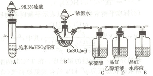 实验操作: 先向 $B$ 中加人浓氨水至蓝色沉淀恰好溶解, 再启动 $A$ 中反应, $B$ 中产生白色沉淀, $D$ 中红色不变色, $E$ 中红色溶液变为无色溶液。