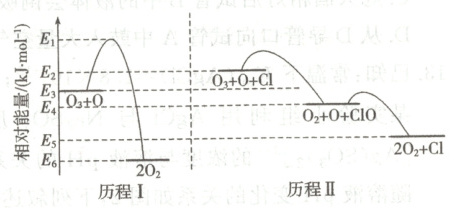 D.历程 $I$ 和 $II$ 中速率最快的一步反应的热化学方程式为 $ClO(g)+O(g)\xlongequal{}O_{2}(g)+Cl(g)$ $\Delta H=(E_{4}-E_{5})kJ· mol^{-1}$