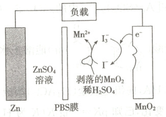 10. B [加入${KI}$后,${I^{-}}$与剥落的${MnO_{2}}$反应生成${I^{-}_{3}}$,发生反应为${MnO_{2} + 3I^{-} + 4H^{+}\xlongequal{}Mn^{2+} + I^{-}_{3} + 2H_{2}O}$、${I^{-}_{3} + 2e^{-}\xlongequal{}3I^{-}}$,如有0.6 mol ${I^{-}}$参加反应,需得到电子0.4 mol,理论上负极${Zn}$减少0.2 mol,质量为13 g,A正确;充电时阳极电极反应式为${3I^{-} - 2e^{-}\xlongequal{}I^{-}_{3}}$、${Mn^{2+} + 2H_{2}O - 2e^{-}\xlongequal{}}{MnO_{2} + 4H^{+}}$,电路中每通过2 mol ${e^{-}}$,阳极区溶液减少的质量小于1 mol ${MnO_{2}}$的质量,即小于87 g,B错误;${Zn}$电极为负极,发生氧化反应${Zn - 2e^{-}\xlongequal{}Zn^{2+}}$,${MnO_{2}}$为正极,发生还原反应${MnO_{2} + 2e^{-} + 4H^{+}\xlongequal{}Mn^{2+} + 2H_{2}O}$,放电时的总反应为${MnO_{2} + Zn + 4H^{+}\xlongequal{}Zn^{2+} + Mn^{2+} + 2H_{2}O}$,C正确;PBS膜能够防止脱落的二氧化锰与锌接触构成微电池,减少锌的损耗,能有效抑制电池的自放电,D正确。]