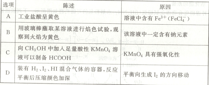 11. A [工业盐酸因含 $Fe^{3+}$ 而显黄色,A 正确;焰色试验需用铂丝或洁净铁丝,玻璃棒中含有钠元素会有干扰,B 错误;酸性 $KMnO_4$ 氧化 $CH_3OH$ 时若 $KMnO_4$ 过量会生成 $CO_2$,C 错误;压缩容器导致 $I_2$ 浓度增大颜色加深,但反应 $H_2 + I_2\rightleftharpoons 2HI$ 是反应前后气体分子总数不变的反应,平衡不移动,原因错误,D 错误。]