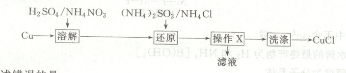 12. D [硝酸根离子在酸性条件下具有强氧化性,可溶解 $Cu$,硝酸根离子被还原成 $NO$ 或 $NO_2$,A 正确;“还原”反应为 $2Cu^{2+} + SO_3^{2-} + 2Cl^{-} + H_2O = 2CuCl\downarrow + SO_4^{2-} + 2H^{+}$,其氧化产物为 $SO_4^{2-}$ 或 $(NH_4)_2SO_4$,B 正确;将 $CuCl$ 沉淀分离出来,应进行的实验操作是过滤,C 正确;硝酸具有强氧化性,可氧化 $CuCl$,D 错误。]
