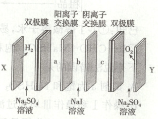 13. D [由图知 $X$ 极生成氢气,发生还原反应,阴极氢离子放电产生氢气,$Y$ 极生成氧气,发生氧化反应,阳极氢氧根离子放电产生氧气,$X$ 极为阴极,$Y$ 极为阳极;$Y$ 极氢氧根离子放电,溶液生成氢离子,向左无法通过阴离子交换膜,$b$ 处的碘离子通过阴离子交换膜进入 $c$ 处,在 $c$ 处生成氢碘酸,同理,$X$ 极氢离子放电产生氢气,溶液生成氢氧根离子,向右无法通过阳离子交换膜,$b$ 处的钠离子通过阳离子交换膜进入 $a$ 处,在 $a$ 处生成氢氧化钠,据此分析答题。电解时,$X$ 极为阴极,$Y$ 极为阳极,电极 $Y$ 的电势高于电极 $X$,A 正确;电解一段时间后,$c$ 室获得氢碘酸、$a$ 室获得 $NaOH$ 溶液,B 正确;双极膜的两侧分别得到 $H^{+}$ 和 $OH^{-}$,据分析知,$c$ 处得到氢离子,$a$ 处得到氢氧根离子,$X$ 极氢离子放电,$Y$ 极氢氧根离子放电,整个过程相当于电解水,所以电解时,需定期向双极膜内补充适量的水,C 正确;当两电极共释放出 $33.6\ L$(标准状况)气体时,即 $\frac{33.6\ L}{22.4\ L/mol} = 1.5\ mol$ 气体,由关系式 $4H^{+} \sim 2H_2 \sim 4e^{-} \sim O_2$ 知,则氢气、氧气分别为 $1\ mol$、$0.5\ mol$,每转移 $4\ mol$ 氢离子,可获得 $4\ mol\ HI$,D 错误。]