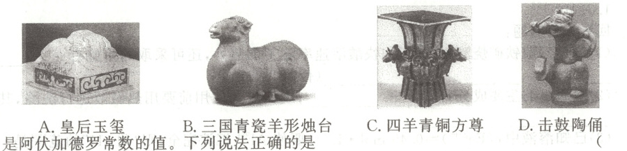 1. C [皇后玉玺通常由玉石制成,玉石主要成分为硅酸盐类矿物,属于传统无机非金属材料,A不符合题意;青瓷属于陶瓷,陶瓷是典型的传统无机非金属材料,B不符合题意;四羊青铜方尊的材料为青铜,青铜是铜锡合金,属于金属材料,而非传统无机非金属材料,C符合题意;击鼓陶俑为陶器,陶器属于陶瓷范畴,是传统无机非金属材料,D不符合题意。]
