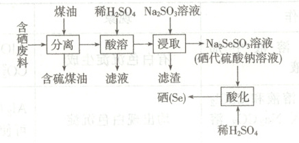 7. A ["分离"时得到含硫煤油为分离固液的操作,方法是过滤,A错误;金属氧化物能和酸反应,"酸溶"操作的目的是除去废料中的金属氧化物,B正确;"浸取"后分离固液的操作为过滤,所用玻璃仪器为烧杯、漏斗、玻璃棒,C正确;"酸化"时${SeSO^{2-}_{3}}$转化为Se和二氧化硫,发生反应的离子方程式:${SeSO^{2-}_{3} + 2H^{+}\xlongequal{}Se\downarrow + SO_{2}\uparrow + H_{2}O}$,D正确。]