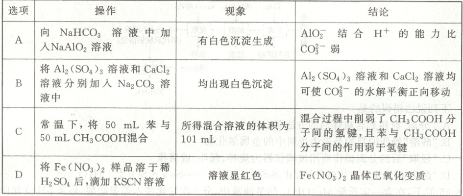 11. C [向${NaHCO_{3}}$溶液中加入${NaAlO_{2}}$溶液,生成白色沉淀${Al(OH)_{3}}$和碳酸钠,则${AlO^{-}_{2}}$结合${H^{+}}$的能力比${CO^{2-}_{3}}$强,A错误;将${Al_{2}(SO_{4})_{3}}$溶液和${CaCl_{2}}$溶液分别加入${Na_{2}CO_{3}}$溶液中,发生反应:${2Al^{3+} + 3CO^{2-}_{3} + 3H_{2}O\xlongequal{}2Al(OH)_{3}\downarrow + 3CO_{2}\uparrow}$、${Ca^{2+} + CO^{2-}_{3}\xlongequal{}CaCO_{3}\downarrow}$,${Al^{3+}}$与${CO^{2-}_{3}}$相互促进水解,可以使${CO^{2-}_{3}}$的水解平衡正向移动,${Ca^{2+}}$与${CO^{2-}_{3}}$结合为碳酸钙沉淀,使${CO^{2-}_{3}}$的水解平衡逆向移动,B错误;常温下,将$50\ mL$苯与$50\ mL\ {CH_{3}COOH}$混合,所得混合溶液的体积为$101\ mL$,说明混合过程中削弱了${CH_{3}COOH}$分子间的氢键,且苯与${CH_{3}COOH}$分子间的作用弱于氢键,导致分子之间的距离增大,使体积变大,C正确;将${Fe(NO_{3})_{2}}$样品溶于稀${H_{2}SO_{4}}$后,酸性条件下,${NO^{-}_{3}}$能将${Fe^{2+}}$氧化为${Fe^{3+}}$,滴加${KSCN}$溶液,溶液显红色,不能说明${Fe(NO_{3})_{2}}$晶体已氧化变质,D错误。]