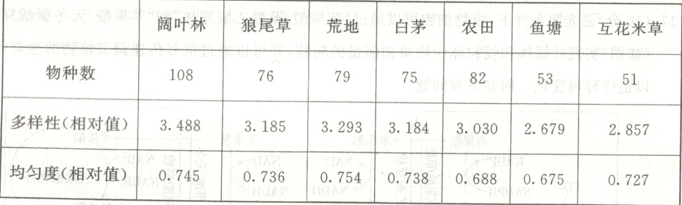 (1)由表格数据可知,鱼塘的鸟类多样性相对最低(2.679),可能是由于植被单一,且人类干扰程度比较大。