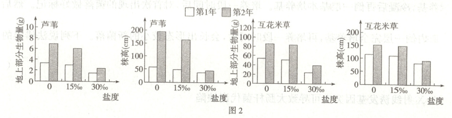(4) 为探究不同盐度对芦苇和互花米草生长发育的影响,研究者设了 3 个盐度梯度:淡水(0)、中盐度(15‰)和高盐度(30‰)。实验结果如图 2,分析图示可得出结论: