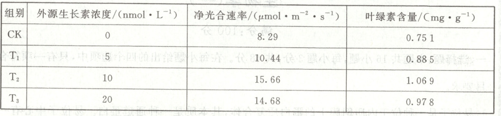 B [由表可知,随着外源生长素浓度逐渐增加,净光合速率和叶绿素含量先增大后减小,因此不同浓度的外源生长素对植株生长的作用效果可能相同,A正确;由表可知,与对照组比较,外源生长素浓度为20 nmoL·L⁻¹时仍促进烟草幼苗生长,B错误;根据生长素运输渠道化理论,植物去除顶芽后侧芽逐渐生长,说明侧芽处生长素外流加强,C正确;根据无关变量相同且适宜的原则,各组应选用生长素合成能力相同、大小一致的烟草幼苗,温度等实验条件相同且适宜,D正确。故选B。]