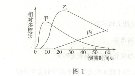 D [在退耕农田上发生的演替为次生演替,是在原有的植被虽然已不存在,但是原有的土壤条件基本保留,甚至还保留了植物的种子和其他繁殖体的地方发生的演替,演替速度快、经历的阶段相对较少,A正确;次生演替的一般过程是草本植物阶段→灌木阶段→森林阶段,甲可能是草本,丙最有可能是乔木,调查乔木种群密度的样方面积一般大于调查草本种群密度的样方面积,B、C正确;图1中纵坐标为相对多度,是该种植物个体数所占百分比,而不是具体的数目,其变化无法直接反映种群密度的变化,30~50年,虽然乙植物占比(相对多度)在减小,但无法确定其具体的种群密度是否在减小,D错误。故选D。]