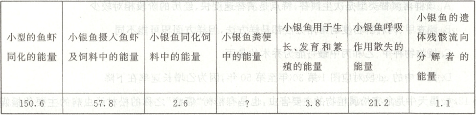 。(3) 小银鱼为肉食性鱼,养殖的小银鱼除饲料外还以小型的鱼虾为食。科研人员对小银鱼的能量流动情况进行分析,结果如表所示(数字为能量值,单位是 kJ/cm2·a)。据表分析,小银鱼粪便中的能量是