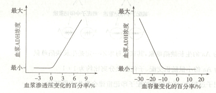 7. 血容量是血液中全部血细胞容量和血浆容量的总和。下图分别为血浆渗透压和血容量的变化对血浆中抗利尿激素(ADH)水平影响的示意图。下列说法错误的是(