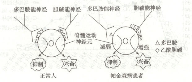多巴胺释放少,对脊髓运动神经元的抑制作用减弱,乙酰胆碱释放多,对脊髓运动神经元的兴奋作用增强