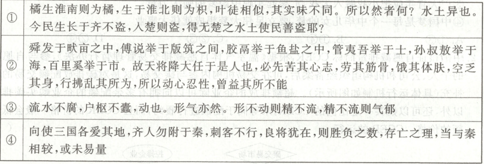 14. A [由橘联想到人、由流水和户枢联想到形气,都属于类比推理,①③符合题意;由舜、傅说、胶鬲、管夷吾、孙叔敖和百里奚的成长经历,得出“天将降大任于是人”必须经历艰难险阻的结论,属于不完全归纳推理,②不合题意;假如当初韩、魏、赵三国国君各自爱惜他们的国土,齐人也不依附秦国,燕国不派刺客去秦国刺杀,赵国的良将还活着,那么六国胜败存亡的命运,应当能够与秦国相较量,也许不能轻易判定,这里涉及的是充分条件假言推理,④不合题意。故选A。]
