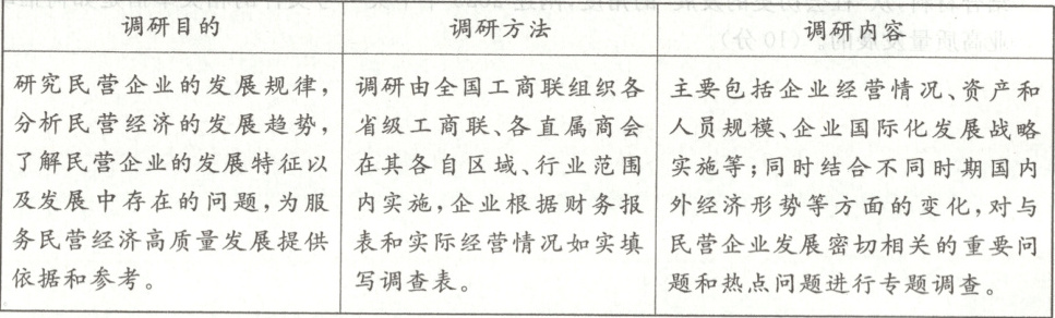 (2)①调研方法坚持从实际出发,了解民营企业的实际经营情况等相关信息,力图追求认识的客观性。②分析和研究民营经济的发展趋势和规律,为服务民营经济高质量发展提供依据和参考,使调研的结果具有预见性。③调研内容运用辩证思维方法,全面、动态地把握民营企业的发展状况。