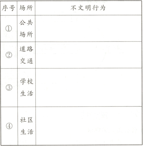 (2)①大声喧哗,乱扔垃圾,争道抢行,等等。 ②过马路不走人行横道,闯红灯,不按规定停车,等等。 ③在教室、走廊追逐打闹,在食堂不排队取餐,不遵守课堂纪律,等等。 ④机动车超速行驶、随意鸣笛,宠物随地大小便,乱贴小广告,等等。