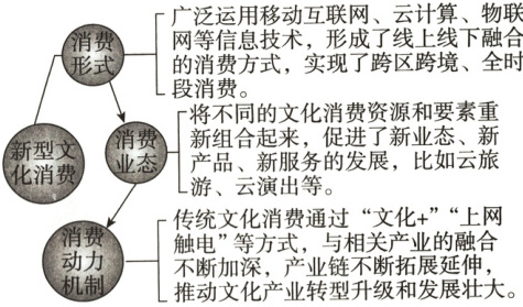 (1)解答本题,第一步:审设问。本题属于措施类主观题,需要调用《经济与社会》的有关知识。第二步:审材料。结合材料文化产业数字化、培育新型文化消费新业态的相关内容,可联系科学的宏观调控;结合材料将不同的文化消费资源和要素重新组合起来,广泛运用移动互联网、云计算、物联网等信息技术,可联系建设现代化市场体系的要求;结合材料促进新业态、新产品、新服务的发展,产业链拓展延伸,线上线下融合的消费方式,跨区跨境、全时段消费,可联系扩大优质文化产品和服务供给,促进文化品牌消费、品质消费等。第三步:整合信息,组织答案。
