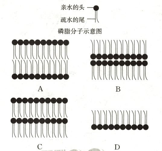 8.A 【解析】细胞质膜的结构 由题图可知,磷脂分子的头部是亲水的,尾部是疏水的,由于细胞质膜的内侧和外侧都有水分子,所以细胞质膜中磷脂分子应排列为两层,磷脂分子的头部位于外侧,尾部位于内侧,A符合题意。