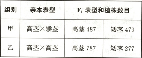 (2)甲组杂交后代高茎:矮茎≈1:1,是测交比例,所以两个亲本的基因型为Dd与dd。乙组后代出现性状分离,且高茎:矮茎≈3:1,属于杂合子自交,亲本的基因型为Dd与Dd。