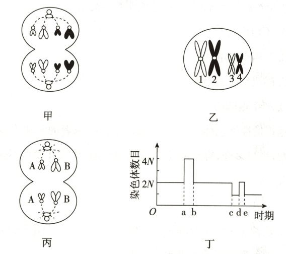 (3)图丙中的4条染色体来自图乙中1、3染色体,因此与图丙细胞同时产生的另一细胞染色体组成为来自另外两条染色体即2、4染色体。