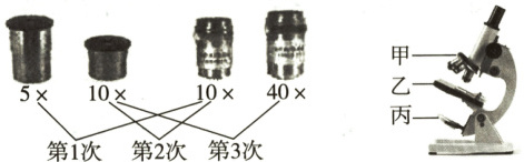 15.B 【解析】显微镜的使用 显微镜的放大倍数越大,所观察的视野范围越小,视野越暗,观察到的细胞数目越少,细胞越大。由题图可知,第1次放大倍数为50倍,第2次为100倍,第3次为400倍,所以第1次观察到的细胞数目最多,第1次观察到的视野最亮,第2次次之,第3次视野最暗,第3次观察到的细胞最大。图中甲为转换器,其上有物镜,转动甲可转换不同的物镜,乙为载物台,丙为反光镜,A、C、D正确,B错误。