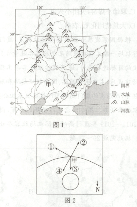 材料一 图 1 为我国东北地区略图, 图 2 为图 1 中某时刻甲地近地面水平方向上等压线图, 图中箭头①—④表示甲地风向及受力情况。