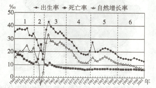2024年1月17日,国家统计局数据显示,2023年末全国人口(不含港澳台)比上年末减少208万人,人口自然增长率为$-1.48‰$。中国式现代化将长期同时面临人口负增长和老龄化带来的挑战。如图是1949—2002年中国人口自然增长变化率。据此完成4,5题。