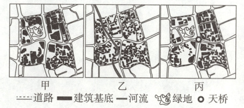 6.A [解析]城镇空间结构及变化 根据图示信息,在发展早期,“大十字”地块重要建筑基底规模较小,混杂分布;后随城市不断发展,大部分区域建筑基底被整合,规模扩大;后期,大部分区域集中连片分布。所以“大十字”地块重要建筑基底演变的顺序是乙丙甲,A正确。