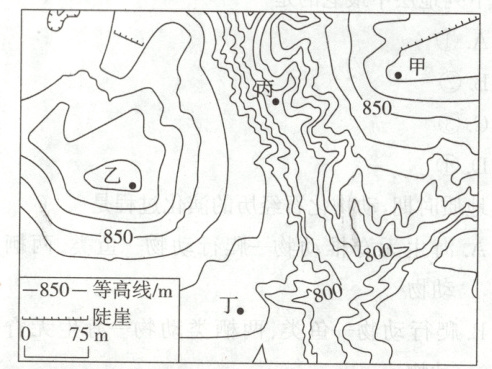 18.C 【解析】等高线地形图的判读 由图可知,图中等高距为10 m,乙处海拔最高,为880~890 m。海拔最低处位于图示区域东南部,为790~800 m,故图示区域最大高差为80~100 m,C正确,A,B,D错误。