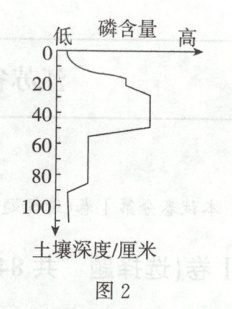 22.B 【解析】影响土壤发育的因素 根据所学知识可知,淀积层是由土壤表层淋洗下来的物质,在一定深度淀积而形成,图中30~40厘米处土壤剖面中磷的含量最高,主要是受上层土壤的淋溶物质积累形成,属于淀积层,B正确;其他土壤深度处磷的含量较低,不是淀积层,A,C,D错误。