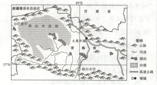材料一 柴达木盆地为高原型盆地,地处青海省西北部,是一个被昆仑山、阿尔金山、祁连山等山脉环抱的封闭盆地。年降雨量平均仅 41.5 mm,蒸发量却高达 3 000 mm 以上,年 8 级以上大风日数可达 25~75 天。