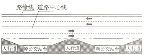 我国西南某特大城市是典型的山地城市, 城区道路复杂多样、交通问题突出。为了保障公交优先, 改善出行环境, 市政部门对老城区部分道路公交停车站进行改造, 在原公交站台的附近, 又增加了一个新站台(如图)。据此完成 36,37 题。