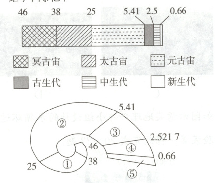 4. D 【解析】地球的演化历史 恐龙最早出现在距今约2.5亿年的中生代,如果将地球46亿年的历史压缩为一天24小时,距今46亿年的时间相当于0时,故恐龙出现的时间为:24 - 2.5÷(46÷24)≈22.7时,最接近23时,D正确,A、B、C错误。