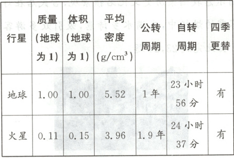1. C 【解析】地理图表的判读 火星质量是地球的0.11,二者相差较大,A错误;地球的公转周期是1年,火星公转周期是1.9年,二者相差较大,B错误;地球自转周期是23小时56分,火星自转周期是24小时37分,二者相差较小,C正确;火星平均密度约是地球的0.72,二者相差较大,D错误。
