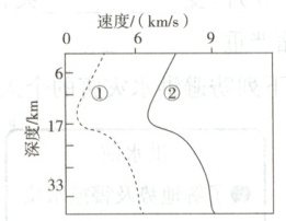 5.D【解析】地球内部圈层结构 莫霍界面为地震波速度发生突然变化的不连续面,结合图可知,波速发生明显变化的深度为17km附近,D项正确,A,B,C项错误。
