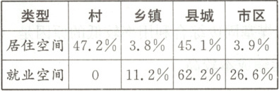 本小题易错选①。由表中数据可知,居住空间中村落占比最高,达47.2%,学生容易认为乡村成为回流城镇化的主要载体。但乡村就业空间为0,说明回流到乡村的居民又就近流入县城就业(即住在乡村,去县城上班),因此促进了县城的第二三产业的发展,促进了县城的城镇化。
