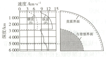 5.A 【解析】地震波波速的变化规律 从图中可以看出,在莫霍界面到古登堡界面之间,地震波波速均变快,且变化都较大,A正确。