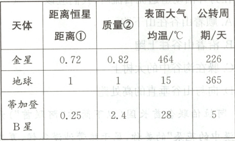 距离地球大约 12 光年的位置有一颗红矮星蒂加登 A星, 绕其旋转的蒂加登 B 星是处于蒂加登 A星宜居带内的一颗行星。 据科学家推测, 蒂加登 B星可能适合人类居住。 如表为金星、地球、蒂加登 B星部分物理性质数据。 据此完成 1, 2 题。