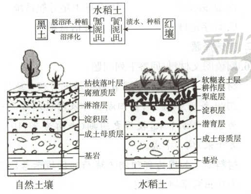 12.D【解析】土壤形成的因素 由材料并结合所学知识可知,水稻土是通过耕种、定向培育等过程,将自然土壤转变成适合农作物生长且质地肥沃的土壤,因此水稻土富含腐殖质,肥力水平较高,B,C错误;由于水稻土是经过人类精心耕作、培育形成的,所以自然形成的枯枝落叶层不会增厚,A错误;读自然土壤和水稻土的土壤剖面图可知,水稻土的结构更复杂,D正确。
