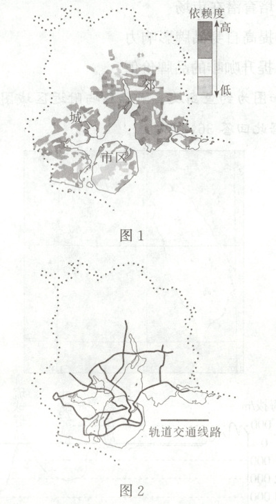 39. A 【解析】交通运输方式选择的差异 由图可知,市区对汽车的依赖程度较低,城郊对汽车的依赖程度较高,B,C错误;市区对汽车的依赖程度低说明市区的公共交通发达,居民出行便利,A正确;对汽车的依赖程度指的是居民出行选择汽车方式的比例,与城郊间人流量没有必然联系,D错误。