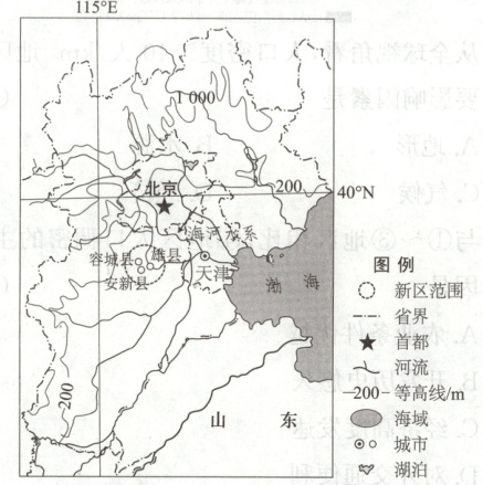 (2)根据材料可知,雄安新区是国家设立的开发新区,因此有政策支持,吸引人口迁入;雄安新区未来被打造为北京非首都职能的疏散地,大量产业迁入该地,经济发展水平高,吸引大量人口迁入。