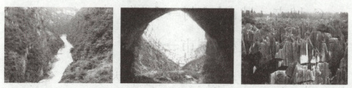 (4)读图并结合所学知识可知,景观照片中,可观察到的喀斯特地貌有天坑和石林,流水地貌有峡谷。