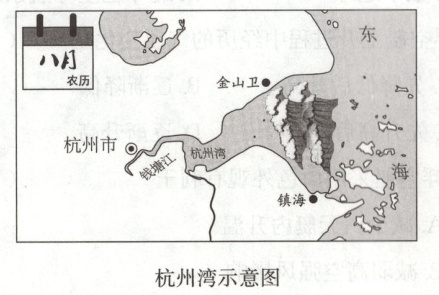 钱塘江大潮号称“天下第一潮”,2021年9月24日,正是农历八月十八,钱塘江杭州、海宁、绍兴段,数百里海塘上成千上万的观潮游客慕名而来,争睹这一自然界奇观。读图完成20,21题。