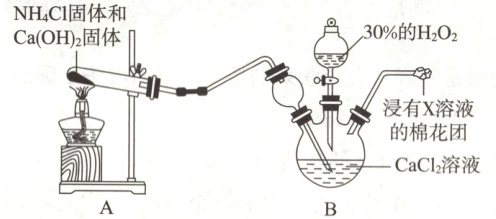 ②装置B中氨气、$\mathrm{H_2O_2}$与$\mathrm{CaCl_2}$反应制备过氧化钙晶体,氨气的尾气处理可用酸性溶液,试剂X可为$\mathrm{H_2SO_4}$等。