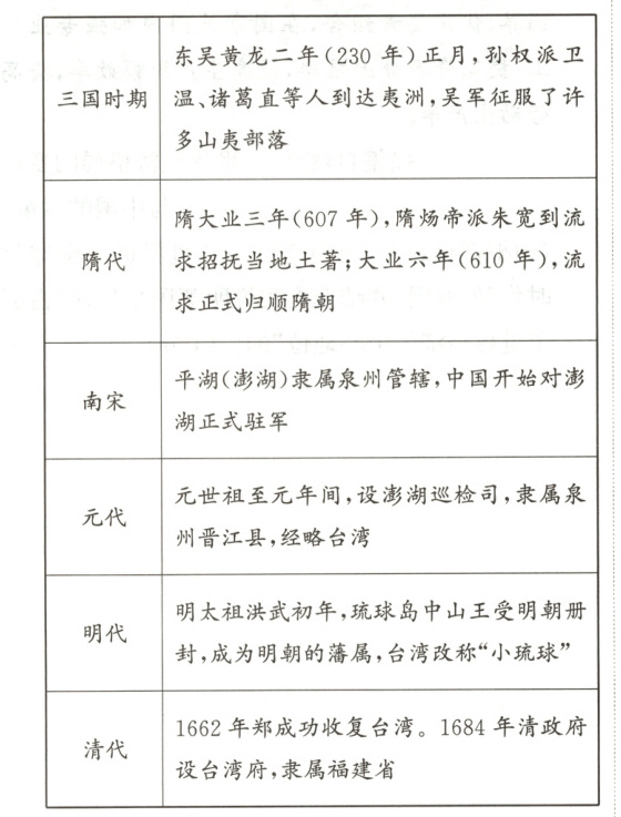 (1)根据材料一,归纳中国古代治理台湾的主要