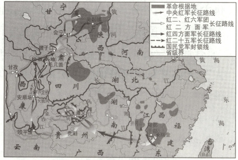 16.B【解析】长征 根据所学知识可知,图片所示事件为长征,“红军不怕远征难,万水千山只等闲”出自毛泽东的《七律·长征》,描写了红军长征路上不畏艰辛、勇敢前行的精神,故B项正确;“扫除帝制建丰功,革命仍愁阻万重”指的是辛亥革命推翻封建帝制,但中国仍是半殖民地半封建的社会性质,革命任务尚未完成,困难重重;“自信挥戈能退日,河山依旧战旗红”指的是抗日战争这一事件;“太行浩气传千古,留得清漳吐血花”是抗日战争时期朱德为悼念八路军将领左权写的诗句,A,C,D三项不符合材料主旨,排除。