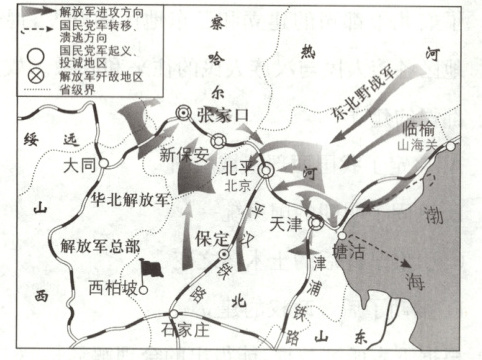 19.B 【解析】平津战役胜利的意义 根据图示“北平”“天津”并结合所学知识可知,此次战役是解放战争时期的平津战役,平津战役的胜利使华北全境基本得到解放,故B项正确;1947年6月刘邓大军千里跃进大别山拉开了战略反攻的序幕;1949年4月23日,人民解放军占领国民党统治中心南京,国民党蒋介石集团的反动统治覆灭;1949年1月淮海战役的胜利,解放了长江中下游以北的广大地区,A、C、D三项均不符合题意,故排除。