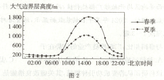 (2)题,由材料可知,缅甸、老挝春耕烧荒产生的大气污染源多;夏季受西南季风的影响,偏西气流为大气污染物进入云南省西南部地区提供了充足的动力;由图可知,春季白天大气边界层高度高,可进入的外来污染物多。第