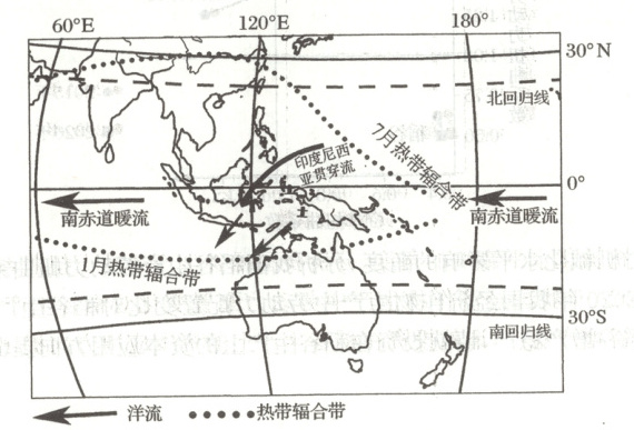 (1)1月热带辐合带南移,澳大利亚北部受热带辐合带影响,盛行上升气流,降水较多;印度尼西亚贯穿流受阻,暖流带来的海水聚积,海水温度升高,蒸发水汽增多;东北信风南移偏转成西北风,从海洋带来较多的水汽。