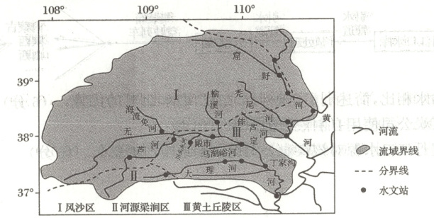 (3)题,根据材料中流域风沙入河量的含义并结合图示信息分析可知,丁家沟水文站以上河段流经风沙区和水蚀区,西北风将风沙区的大量沙粒带入河道,为汛期输沙提供了丰富的沙源;同时河源梁涧区和黄土丘陵沟壑区的支流又挟带大量风积细沙入河,故风力作用对丁家沟水文站以上河段风沙入河量贡献率最大。